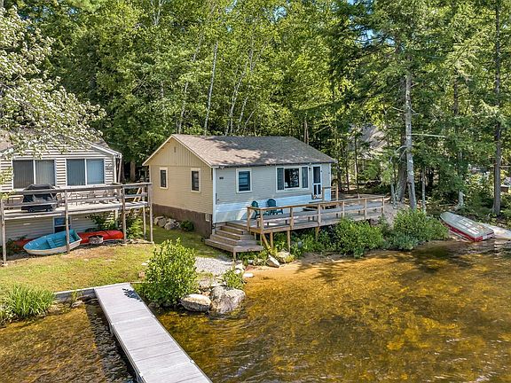 Western facing lot with 215’ of owned waterfront on Lake Winnipesaukee that includes 2 cottages very close to the water on a level lot with walk-in, sandy frontage and oversized dock in desirable and low tax Moultonborough. Enjoy summer days full of afternoon sun and exceptional sunsets from this 0.72 acre waterfront that includes a 3 bedroom, 2 bath cottage w/ full, walk-out basement, heat and central AC, as well as a 3 bedroom, seasonal bunk house. Enjoy sandy bottom frontage near the shore and walk-in area for swimming sheltered by a peninsula, which offers privacy and also provides protection from wind and chop. The dock was recently improved and offers multiple configurations to dock watercraft. The cottage is quaint and offers relaxed lakeside living very close to the water with exceptional lake and mountain views. The lakeside deck is a wonderful spot to dine alfresco, watch the sun go down and watch the stars. Open concept living area includes an updated & fully applianced kitchen with center island, spacious dining area and living room. The main floor also includes 3 bedrooms and 2 baths. The lower level is partially finished and full walkout. Seasonal bunkhouse offers wonderful space for guests and includes 3 bedrooms, a den, living area and bathroom, as well as a newly replaced lakeside deck. Use the cottages as they are or build your dream lake house. 2 baths have a shower, 1 has a tub/shower.