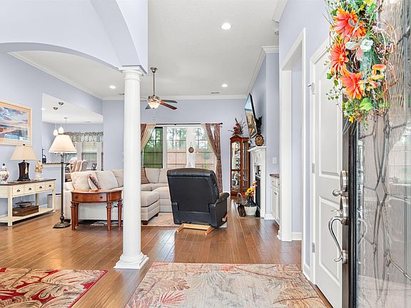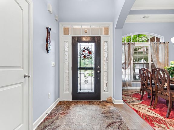 Light-filled with soaring ceilings! This home lives wonderfully with a semi-open floor plan, allowing communication between living areas but with some separation from the kitchen. The kitchen boasts granite countertops, stainless appliances, a double oven, and a very large walk in pantry. A formal dining room, breakfast bar, and breakfast nook provide plenty of dining options. The family room is comfortable and inviting with ceiling fan and fireplace with built in cabinetry. The back wall of glass sliders beckons you out to enjoy the large screened porch with EZ Breeze windows, tiled floor, already set up for a television. From the porch, you just step outside to the custom pergola and built in outdoor kitchen. Large patio easily accommodates a hot tub. Primary bedroom is on the first floor with garden tub, glass shower, double vanity, and custom double closet. An additional 2 bedrooms with adjoining bathroom is on the first floor, along with a powder bath and laundry room with sink. A spacious flex room with closet and ensuite full bathroom upstairs could be used as a 4th bedroom. This beautiful home faces a pond with a fountain and the fully fenced back yard backs up to woods. The oversized garage (21' x 22') is fully finished with epoxy floor and built in storage. The gated neighborhood of Cypress River Plantation has a boat dock and launch; boat storage; playground; tennis/pickleball court; and a country club style club house with 2 pools, a bathhouse, and common areas to grill and socialize. This squeaky clean, move in ready home offers a wonderful lifestyle in a wonderful neighborhood! Measurements and square footage are approximate. The buyer/buyer's agent is responsible for verifying ALL information in the MLS including lot size, HOA Information, square footage, etc.