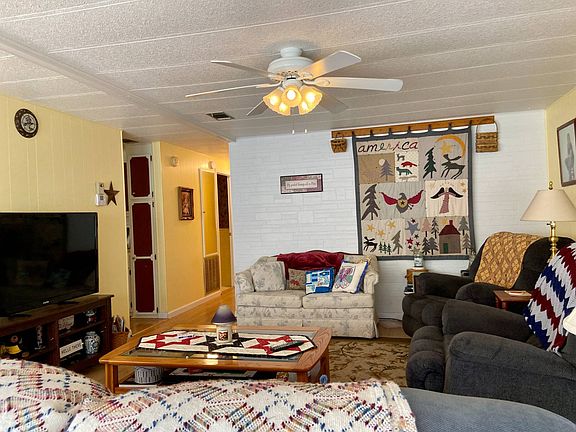 This is a mobile home for sale in a 55+ community on a rented/leased lot. WATER VIEW HOME on Sunset Pond with desirable reverse floor plan where living space faces the water views. The home was painted outside in 2020, Tie Downs were updated in 2016 & hot water is an energy efficient On-demand unlimited supply system. The entire home has newer laminate floors. The HVAC keeps everything cool! This home is mostly furnished & includes TVs, all interior & lanai furniture. The kitchen has plenty of cabinetry. It is fully stocked with dishes, silverware, pots pans & even the linens are included to be move in ready! The dining room has a built in wall cabinet with more storage, mirror, drawers & display area for your treasures. Spectacular water views from the dining room table and from the living room area as well. The living room has a sliding pass thru door to the air conditioned Florida room. It has low pile indoor/outdoor carpet and trendy curtains on windows that face the water. There is a door to the outside for direct access to the sitting area under the overhang facing the water. Great place to sit to watch all the water fowl and other local wildlife. Generous master bedroom has a large walk in closet with a vanity area that is next to the en-suite bath with walk in shower plus commode. Guest bedroom has a closet and a built-in storage cabinet. The guest bath has a tub/shower combo with ceramic tiles around tub. The screened lanai off the carport is attached to a large shed where the laundry hookups are located (washer/dryer included) and extra storage area. Cool breezes flow through the screened area for those warm summer afternoons! You can view & hear the pond fountain from the lanai or covered sitting area on the back of the home. It sits on a deep large lot with an oversized yard & lawn that meets the pond edge. Sunset pool is at the far end of the pond for a hot afternoon swim with neighbors and friends. This home is located on the North Side that has the Harmony Hall sports complex with the new fitness center & coffee bar and many sports courts such as Pickle Ball, Tennis & Shuffleboard. North section has 3 pools to choose from plus the brand new pool at the Oaks for a total of 6 to choose from for an afternoon swim. The monthly land lease at $1,110 includes everything except for your personal electric use & Internet. Florida MH Sales, LLC cannot guarantee or warrant the accuracy of this information, measurements or condition of any property. Measurements are approximate. All homes are sold "as is" and personal or professional inspection is encouraged. Lot rent is set by the community and is subject to change. Community application & approval required. Location: Midway between Tampa & Sarasota & just minutes from the interstate in Manatee County. Easy access to airports in Tampa, St. Pete & Sarasota. The Gulf Islands of Anna Maria, Longboat Key, Lido Key & Siesta Key are all less than 1 hour drive. Don't forget that the big theme parks are within driving distance! NEARBY: Dining: Waterfront Casual & Fine Dining (seafood & local catch of the day) & sightseeing dinner cruises. Nightlife & Live Entertainment: Tiki Bars: Whiskey Joe's, Woody's River Roo, Caddy's on the River Shopping: Ellenton Outlet Mall, University Town Center Mall, Costco, antique & thrift stores. Fishing & Boating: Anna Maria Island & Sky Way Bridge (State Park) Fishing Piers. Fishing, shelling & dolphin charters, parasailing & jet ski rentals. Nearby Attractions: Over 7 miles of free public, sugar sand beaches, Mote Aquarium, Science & Nature Museum, Railroad Museum, Performing Arts Theaters, Golf Courses & Country Clubs, Bradenton Convention Center, Robinson & Emerson Preserves, River Walk & Playground, Selby & Palma Sola Botanical Gardens, Gamble Plantation Historic State Park, Sarasota Jungle Gardens & Animals & Lowry Zoo plus much more!