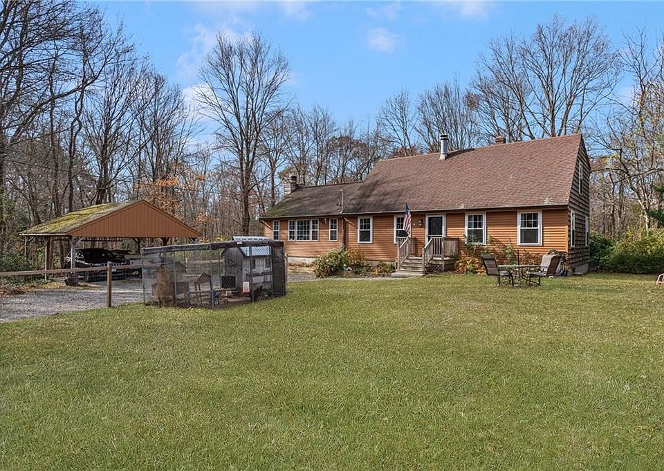 If you are looking for a rural retreat offering peaceful, wooded seclusion, then come see all this awesome 4 bedroom Cape Cod home has to offer! Situated on a sprawling 3.1 acre lot and located on a dead-end street, this property has added value for those who seek a destination in the woods near wildlife! The home has a great deal of living space (close to 2500 sq') and has an awesome floor plan suitable for large, growing families! When you enter the home, you are welcomed by a fireplaced living room which leads into an open kitchen with breakfast bar, ideal for entertaining and parties! From there you are led into a massive 22' x 24' great room with cathedral ceilings, pine hardwood flooring, walkout to back deck, and a second fireplace with pellet stove insert ideal for cold winter nights! Also on the first floor is the first full bath and two first floor bedrooms. The second floor has two larger bedrooms and a second full bath. The lower level has a large recreation/living room with bar, a second pellet stove as well as a walkout to backyard. Many recent updates throughout including new windows and slider in 2022, upgraded 200 amp electrical service in 2021, new carpeting in 2022, fresh paint throughout, and both full baths have new vanities with quartz countertops! Property also has a large gravel driveway that easily suits numerous vehicles, and a carport with enough room for two vehicles. Also peach & pear trees and many perennial gardens!
