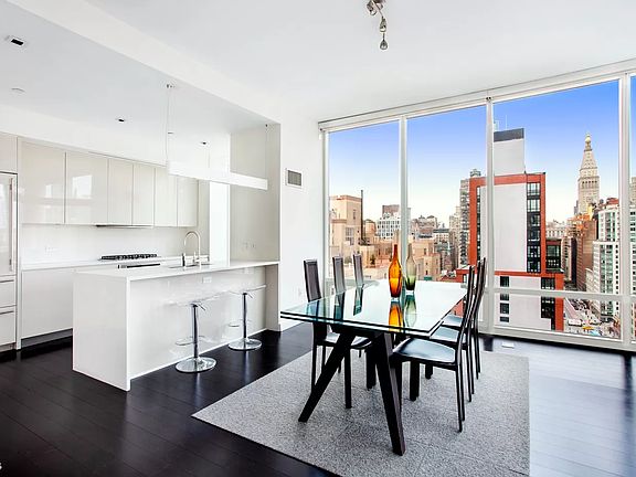 Perched high above Gotham, this chic 3 bedroom Condo has the wow factor that you've been looking for. This stunning corner unit 3 bedroom,2.5 bath home is wrapped with floor to ceiling windows and exudes a hip, Manhattan sophistication. Boasting an impressive 10' ceiling throughout, the sense of space & volume is present in every room. The focal point of the property is the grand 33' x 16' living room which offers expansive views North & West. Our time lapse video shows just how dramatic the light shifts can be from this unit, including the dramatic sunsets. Whether It's dinner for 10, a family gathering or simply reading a book curled up on your couch, this room has a timeless appeal you will enjoy again & again. At the heart of the home is fully equipped, professional grade kitchen package outfitted with abundant stone counter space and white laquered cabinets.