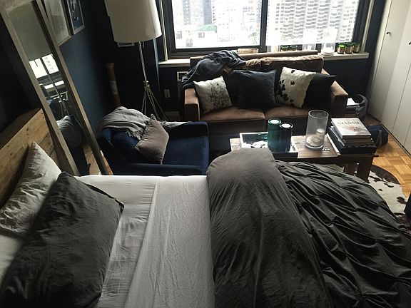High rise building with modern finishes and a great view (first picture is actual view from the apartment). Spacious layout with panoramic view of skyline including Chrysler building and Roosevelt Island. Wood floors. Two bedroom convert and one bath. Easy access to public transit (M34 and 6 train). Appointments welcome.