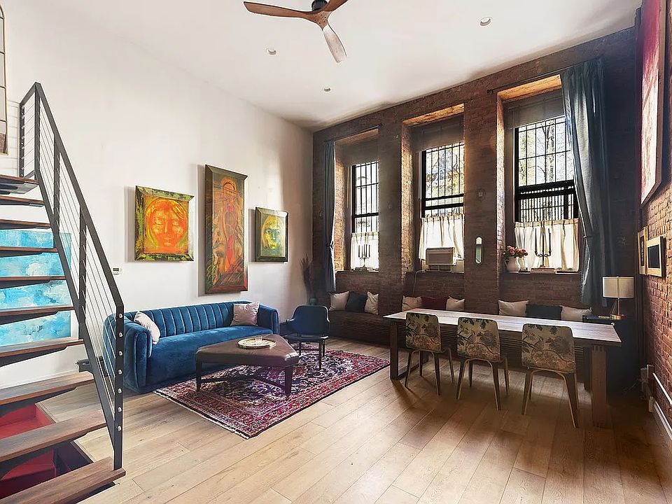 Can be rented unfurnished, partially furnished or fully furnished. One of a kind furnished triplex loft in the heart of the East Village! This unit features incredible architectural detail, thirteen and a half foot ceilings and tons of space sprawling across all three levels. When entering the unit, you will be greeted by a spacious living and dining area with oversized windows. Also on the main floor, you will find an additional room, which can be used as a home office or an additional bedroom. On the mezzanine level above the the main floor is the primary bedroom featuring a large walk in closet. Below the main level you will find another large room, which is currently being used as a screening room. This coop building is located on a quiet block and features laundry as well as free bike storage. Quick and easy board approval! Fees: Refundable $500 Move in deposit Refundable $500 move out deposit $400 lease handling fee $20 credit check fee