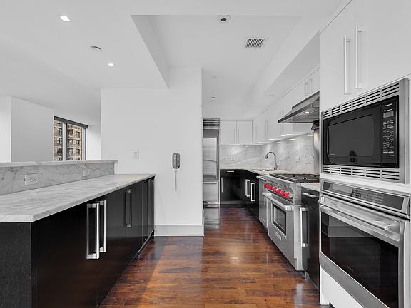 Modern elegance meets Upper East Side charm in this spacious 4-bed, 4.5-bath corner residence at 300 East 79th. A dramatic entry gallery leads to a sun-drenched great room with floor-to-ceiling windows and sweeping views to Central Park. The open chef's kitchen stuns with Calacatta marble, Sub-Zero and Wolf appliances, and custom cabinetry. The primary suite boasts western light, two walk-ins, and a spa-like bath. All bedrooms feature en-suite baths and generous closets. Walnut floors, Bosch laundry, and a powder room complete the home.