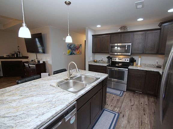 Eldridge Iowa Real Estate For Sale! Beautiful 2 Bedroom / 2 Bathroom 2nd Floor Condo that is Like New Condition with Luxury Vinyl Plank Floors Throughout, Spacious Kitchen Island, Lots of Kitchen Cabinetry, Pantry, Loads of Kitchen Outlets & Counter Space, Large Living Room with Gas Log Fireplace, 16 x 7 Deck with Nice View, Double Storage Closets off Deck, Huge Primary Bedroom with 11 x 4 Walk-In Closet & Full Bathroom with Double Sinks, Ceiling Fans Throughout, & Laundry in Unit! Condo is Located close to Shopping, Restaurants, Grocery, Schools, & More! Bar Stools Stay & Bench/ Shoe Storage is Negotiable.