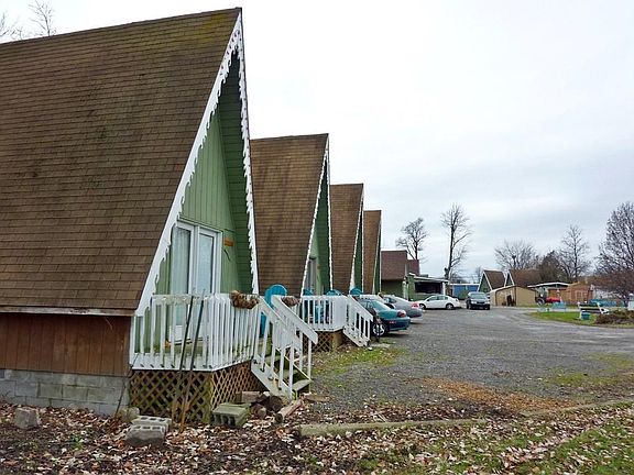 Check out the Villa Rentals! This complex features 17 units: 16 with leases and one designated for overnight accommodations! There are 6 a-frame units, 3 homes and 8 apartments. A-frame units - owner pays all utilities: 4 have 1 bedroom, loft & a bathroom (rent is $800-850/mo each); 2 have loft & bath with heart-shape tubs (rent is $800/mo or $100/night). Apartments - owner pays all utilities: two 1 bedroom, 1 bath units (rent is $650-750/mo each); two studio units (rent is $650/mo each); four efficiency units (rent is $450/mo each). Unit#9 Home - owner pays sewer/trash: three bedrooms and one bath (rent is $850/mo). Unit#16 Home - owner pays trash: one bedroom and one bath (rent is $550/mo). Main Unit home - owner pays water/sewer/trash/electric: three bedrooms and one bath (rent is $950/mo). There is a coin-laundry room and the machines are owned. The land is located along US 33, across from the Lakeview harbor, near downtown and offers 1.3 acres with a garage and two sheds.