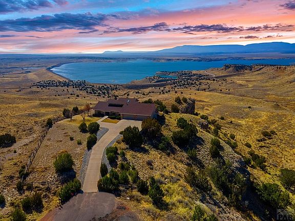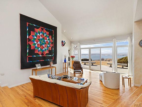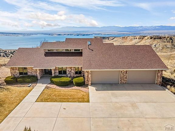 In a Premier Liberty Point location, this rare gem is located on your own private bluff overlooking Lake Pueblo and captivating views of the Colorado Rocky mountains. This home was designed to capture beauty from every angle with walls of windows to take advantage of the panoramic views. For outdoor lovers, the neighborhood trail access to the conservation area and state park is walkable. This beautiful 4 bedroom 5 bath home was custom built and has had wonderful modifications done over the years to keep it desirable. A living room, an upper level family room, a lower level family room, formal dining area, an informal dining area, and outdoor trex decks contribute to the livability The primary suite is the entire upper level of this home with a it's own wall of windows and a walk-out to a private deck taking advantage of the stunning views. Low maintenance landscaping and a 4-car attached garage rounds out the appeal. This home is a must see!