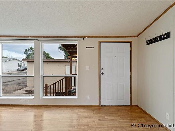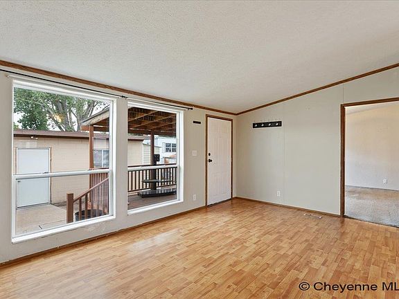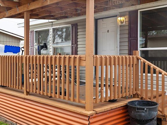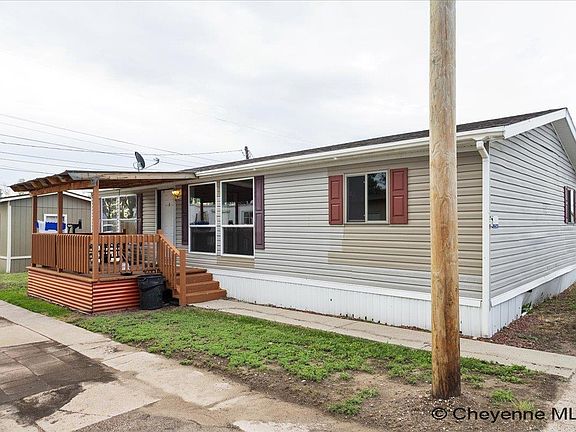 An affordable modern manufactured home opportunity awaits, just three miles south from Downtown Cheyenne! This 2002 Four Seasons Mobile Home offers three bedrooms and two full-sized bathrooms. Approximately 1,260 square feet with spacious room sizes. Large covered deck for outdoor entertaining. All kitchen appliances along with a washer and dryer included. Additional bonus storage with a 9 ft x 14 ft metal storage shed included. Conveniently located in Cimmaron Village Mobile Home Park just off of South Greeley Highway and East Prosser Road. The mobile home park has a $631 per month lot rent that includes water, sewer and trash removal. The manufactured home park amenities include: covered mailboxes, lighted streets, on-site maintenance, on-site sales and management office, playground, pets welcome. Owner-occupants only and all applicants must be approved by the manufactured home park. For more information on Cimmaron Village:  https://www.bayshorehomesales.com/communities/cimmaronvillage.