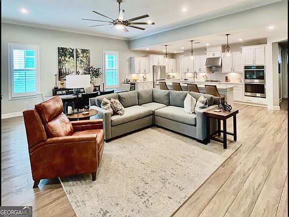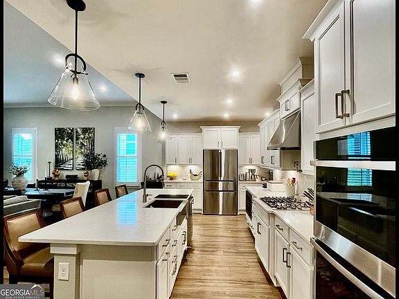 2,682 total sq ft. 3 bed, 3 bath Cresswind Twin Lakes, Gourmet Kit, custom shelving office, open concept, living, dining, kitchen. Custom 4 ft extended garage with epoxy sealed floor, gladiator wall system, oversized front entry porch, Extended patio, retractable screens, cedar pergola, stone countertop built in grill, LVT flooring, custom plantation blinds, custom closets, and pantry, ceiling fans in all rooms, 11 ft ceiling, coffered tray ceilings in main bedroom and entry, secluded back yard, plenty of green space, must see sunsets. This house is part of a Gated Community that offers a Resident Only Clubhouse with a Full Time Activities Director, a Resort Style Outdoor Pool and an Indoor Pool with Lap Lanes and Spa. Pickleball enthusiasts will appreciate one of Georgia's Largest Pickleball Complex. The Training Center includes a Smart Circuit Training that provides users with an individualized strength training program, Cardio equipment and Weights. The nearby Exercise Studio is fully equipped and is utilized daily to offer group classes for Yoga, Pilates, Aerobics, Zumba and Line Dancing. There is also an Art and Crafts room with Kiln, a Lounge with Casual Seating Spaces, Billard tables and a Multiple Event Space that includes a Demo Kitchen and a Ballroom. A Dog Park, Walking Trails, Community Garden area, Lake with Dock and Boat Launch for non-motorized craft, for Paddle-boarding, for Kayaking, Canoeing and Catch and Release Fishing, and an Event Lawn with Covered Stage are all available amenities.