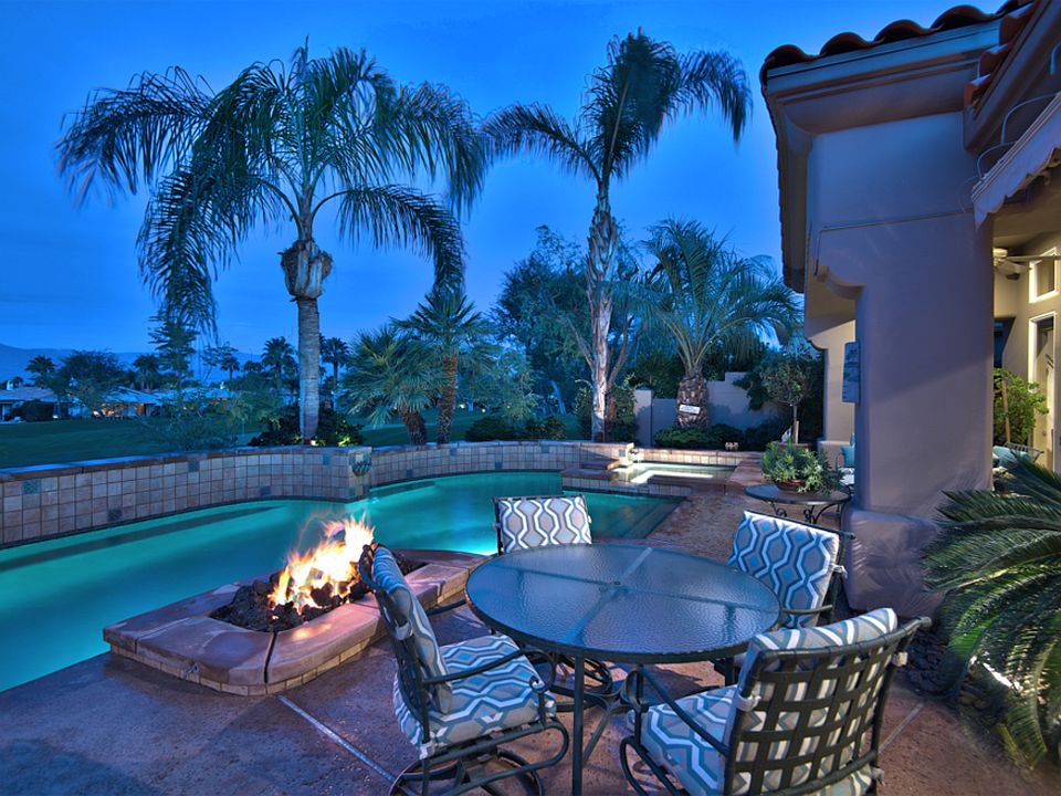 Artistry and elegance is captured at every turn of this Bougainvillea 2 floor plan in Indian Ridge. As you enter the custom glass leaded door, your eyes will be instantly drawn to the spectacular pebble tec salt water pool with fountains, spa, and views of the expansive golf course and mountain ranges. Ambiance on the patio abounds with the gas fire pit, electric awning with wind sensor, an extra large lighted BBQ island with oversized BBQ, refrigerator, two burner stove top and plenty of seating at the bar for entertaining. Attention to detail is evident at every turn in the home. The newly remodeled kitchen has high-end Thermador stainless appliances, glass tile backsplash, granite counter tops, âEURœVuelo CollectionâEUR faucet and full extension roll out drawers. The built-in entertainment center hosts surround sound Bose speakers, sub woofer, 60âEUR Panasonic 3D TV, leather Stampede Motion recliner love seats and the âEURœMonster Power CenterâEUR to control the electronics. Additional features include Mohawk âEURœSmartstrandâEUR carpeting, large floor tiles, faux painted walls, life source carbon water filter, plantation shutters, marble and granite throughout, Toto high efficient toilet, and the list goes on and on. This is definitely a one-of-a-kind home!