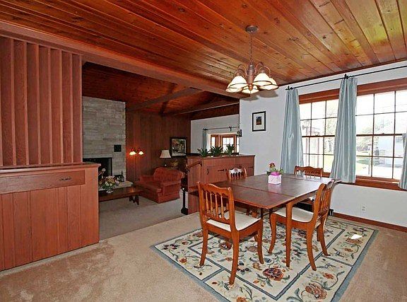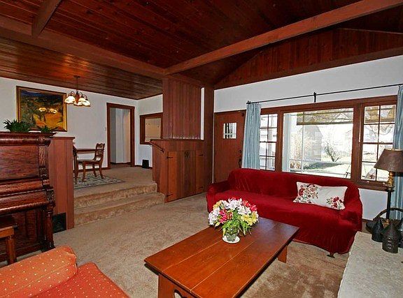 More than meets the eye. Beamed cathedral ceilings, skylights,floor to ceiling fireplace,separate dining room,eat in kitchen nicely updated. 3 bedrooms, 2,5 bathrooms,including a master suite. Ceiling fans,large screened in porch, first floor laundry with lots of storage. Full basement with a workshop. Corner lot with mature trees,beautifully landscaped yard, huge 2.5 car garage, walk to town, train,library. SWEET