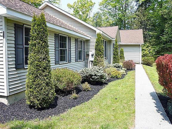 One of Rutland's hidden secrets and this is a bargain at this price! This is such a unique opportunity that it may be years before another property like this comes on the market. The minute you get out of your vehicle you hear the nearby waterfall, nature singing and a sense of peace and quiet comes over you. To find an immaculate ranch built in 2007, constructed with opulent materials, and having an incredible open floor plan, is not always easy to find. This amazing home offers a primary bedroom w. large bathroom on one wing of the house while on the other side you will find two additional bedrooms(one w. Murphy bed which conveys) along with a full bathroom. The custom kitchen has everything the chef of the family could ever desire. The large central dining room can accommodate large gatherings and has glass doors that lead to your rear deck, offering extreme privacy. The formal living room w. gas fireplace offers beautiful wood floors, an abundance of windows and just an overall feeling of comfort. The lower level offers easy access and has a 20x26 family/office room w. gas fireplace, half bathroom, and walks directly out to the rear yard. There is also a large utility room that offers plenty of storage along w. modern mechanicals. The HOA fee is $1,125/quarterly and covers lawn care, trimming, mulching, garbage, plowing/shoveling of driveway and sidewalks, along w. use of community pool and tennis court. Pet restrictions! Living just got easier!