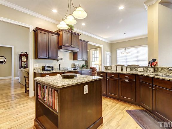 Almost 2 acres (4 car garage) 2 attached, 2 detached heated/cooled. Main floor master w/tray ceiling. Keeper room, gas fp in KR & FR. Must see the large gourmet kitchen w/granite, center island & stainless. Separate dining. Hardwoods, blinds & shutters. Bonus rm, Screened porch, grilling deck, belgard patio, Pergola arbor. 4 bed 3.5 bath. Tons of privacy, excellent location, near Jordan Lake, shopping. Hwy 64 & 540. Visit the tour!