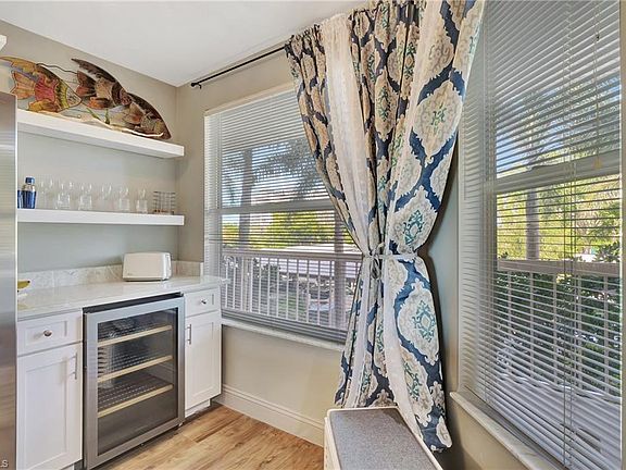 FACING WEST!! VIEWS & SUNSET SKIES from your lanai, living area and master bedroom. Boat Lovers Dream. This Quality renovated 2 bedroom, 2 bath Condo was done a year ago, kitchen wall removed, over-sized quartz counters, extended to backsplash, additional bar/cabinets added with wine refrig., plus stainless appliances. The (Luxury vinyl) wide wood grain floors flow throughout. Lighting, fans & all door handles offer a stylish modern Decor. Master bath has separate dual sinks, a custom soaking tub, glass enclosed custom shower & even added a linen closet. Guest bath has glass enclosed walk-in shower. A/C replaced, tankless water heater, electric hurricane shutter. THIS BLDG HAS LOWEST HOA IN WIGGINS BAY & ready for a new paint color. Come enjoy and have Income too. Seasonal renter for Jan 3 - April 3 at $19K. This condo is within steps of the Tarpon Cove Beach & Racquet Club with amenities to enjoy. Restaurant, Tiki bar, tennis, fitness, boat taxi to beach, resort pool, bocce and loads of social events, private membership , ask about details/costs.