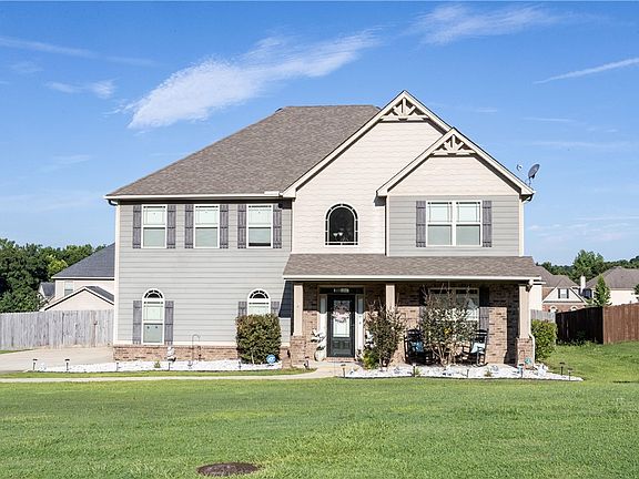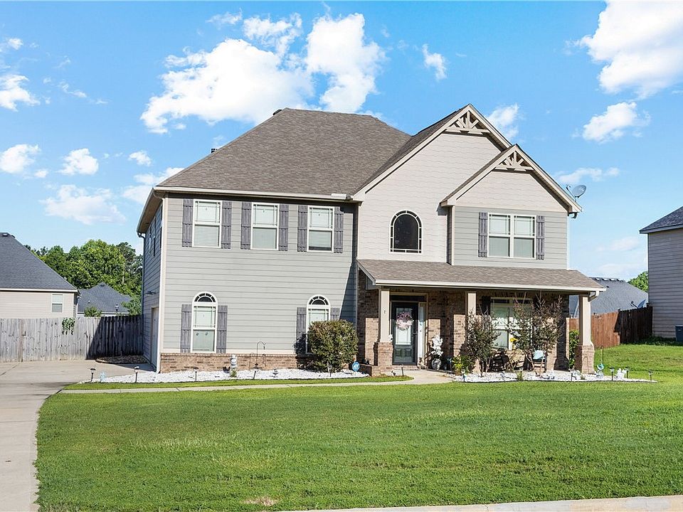NEW PRICE ON THIS HOME! Welcome to this beautifully designed and spacious home situated on a desirable corner lot. Step inside to a stunning foyer that sets the tone for the rest of the home, featuring rich hardwood flooring that flows seamlessly through the formal dining room, breakfast area. In addition, there is also a dedicated home office. The gourmet kitchen is a chef’s dream, complete with granite countertops, a large center island, walk-in pantry, and a double oven—perfect for hosting and everyday meals.Upstairs, you’ll find four generously sized bedrooms. The luxurious primary suite boasts an enormous walk-in closet and a spa-like bathroom with a double vanity, soaking tub, and a beautifully tiled walk-in shower. Enjoy outdoor living in the fenced backyard featuring a covered patio area and a built-in firepit—ideal for relaxing or entertaining year-round. All appliances stay, including Maytag Washer and Dryer all tvs + newer model refrigerator and a carpet allowance with an acceptable offer.