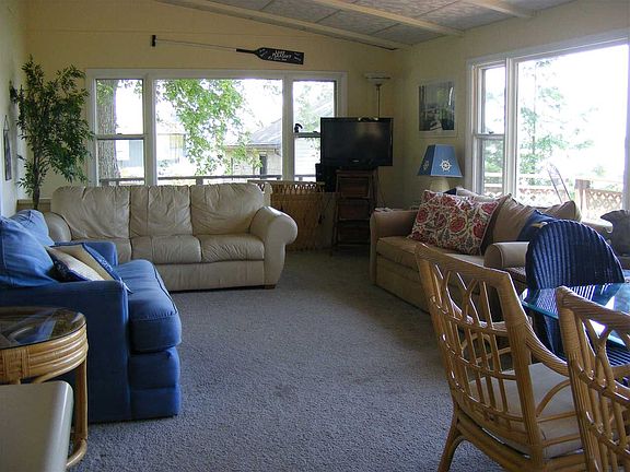 Lake Pleasant with 425 acres of high quality and high water clarity, is awaiting you! This cottage provides spectacular views of this beautiful all sports lake plus incredible sunsets through the large expanse of full glass windows on the main floor and upper expansive deck with porch underneath. A spacious kitchen, living/dining room, bathroom, and master bedroom are on main level. Lower level contains large family room, another bathroom, laundry area, bedroom, and generous storage. Tandem 1 1/2 car garage houses a nice workshop area with plenty of built-in cabinets plus storage on lakeside via overhead door & inside access steps to garage. Gas water heater, 90%+ high efficiency gas furnace, 200 amp service, washer, dryer, electric range, microwave, high quality Kinetico water softener, 4 inch well, and 5 yr. old refrigerator and dishwasher are included. Snack bar and many cabinets in spacious kitchen. Public sewer will be connected summer 2016. Large wood dock for water toys is at water's edge and in-ground irrigation is a plus. House roof is only two years old. Present owners enjoy the sandbar on other side of island in front of this cottage. Lake Pleasant offers a marina, which many lakes do not; 2 places to buy gas; 2 boat ramps, a large sandbar, store for ice cream and miscellaneous items; and great fishing also.