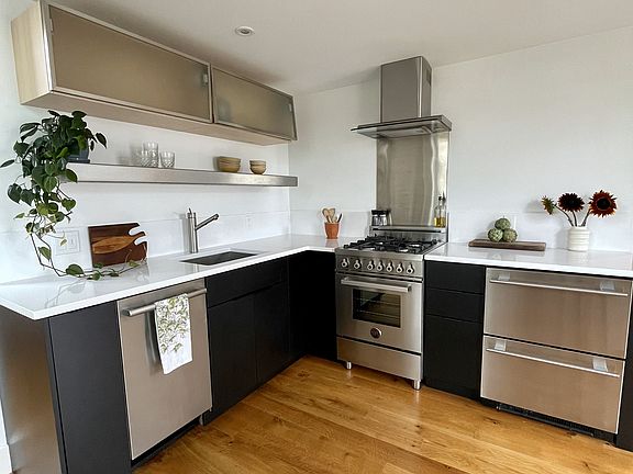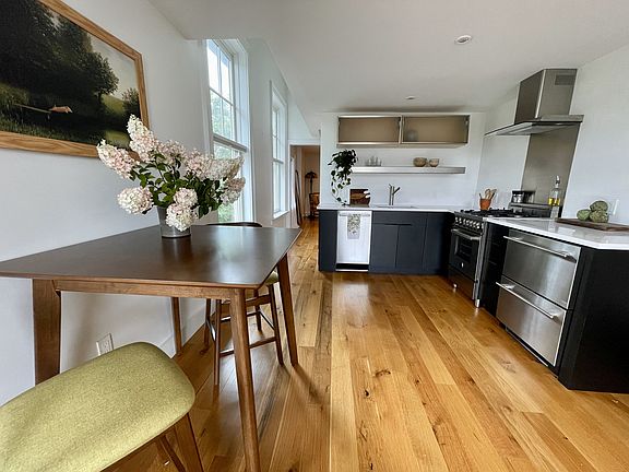 Gorgeous second story corner unit furnished condo at the foot of the Hill Section in Downtown Burlington, walking distance to Church St, Waterfront Park and UVM Campus. This modern 1-bedroom (+ loft) has been beautifully renovated utilizing top of the line materials, appliances and fixtures. White oak flooring throughout plus Hunter Douglas blinds on all windows and beautiful 5-panel Shaker-style doors. Custom cable railings define the spaces while maintaining the open and airy feel. The space is bright and warm with impressive high ceilings and huge windows all around with views of Lake Champlain and the Adirondack Mountains. The fully updated kitchen features white quartz countertops and backsplash, custom cabinets, and top of the line appliances: Bertazzoni Professional Series Gas Range, Haier Undercounter Dual Drawer Refrigerator, and Bosch Dishwasher. The spacious full bathroom includes a soaking tub with a full tile surround, vanity with vessel sink, and full size washer & dryer with well appointed laundry area with wood counter and shelving above. Upstairs, a bright and spacious loft area with twin skylights and huge closet makes a great second living room, guest bedroom, or office. New furnace & A/C in 2016, and exterior upgrades include new Marvin historic windows with insulated glass in 2018, and exterior paint in 2020. Generous closet space throughout. Two dedicated off-street parking spaces included. This apartment is offered fully furnished and available for lease beginning January 1st. Renting unfurnished may be an option if desired. All utilities including high speed internet with wifi are included for $200/mo. Minimum lease term is 3 months, 6 to 12 month term preferred.