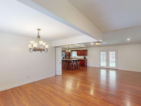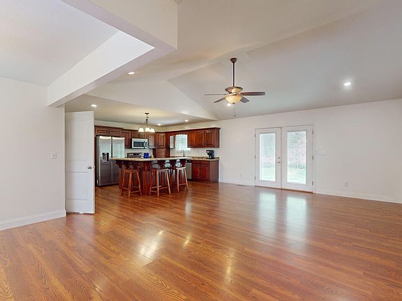 This beautiful home is perfect for those who need ample garage space, featuring a detached three-car garage, with an attached carport, an oversized attached garage attached to the home, and a single basement garage. Inside, the main floor offers 3 spacious bedrooms and 2 full baths, all adorned with stunning hardwood flooring. The living room boasts a vaulted ceiling, double doors out to the back patio that is covered. The finished basement adds 2 additional rooms, each with closets, and is plumbed for a bathroom. Step outside to enjoy the lovely view from the front porch, and take in the peaceful ambiance of the small pond on the property. With over 6 acres of land for your privacy. Spectrum Fiber Optics Available for internet