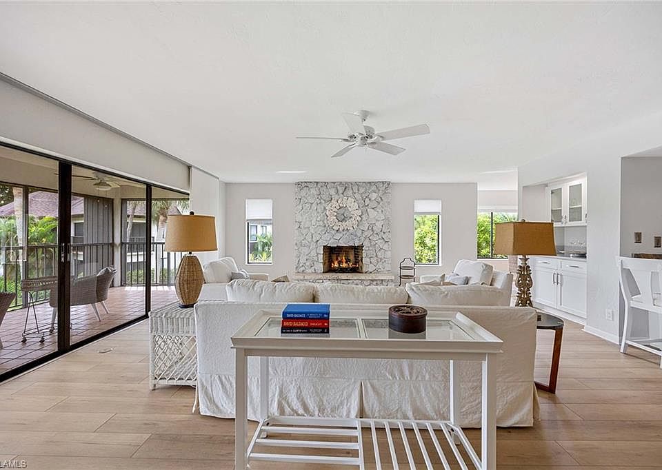 This spacious 3-bedroom, 2.5-bath second-floor end unit combines comfort, light, and flexibility in a thoughtfully designed layout. The open living and dining area is filled with natural light, creating an inviting space for everyday living and entertaining. The private master suite offers a peaceful retreat. Enjoy sweeping views from the expansive, screened balcony, the perfect spot for morning coffee or evening sunsets. Additional highlights include a cozy fireplace, built-in bar, balcony off the morning room, detached one-car garage, and ample guest parking. Nestled amid lush, mature landscaping, Misty Pines offers a serene, park-like setting with convenient access to shopping, dining, beaches, and all that Naples has to offer. Community amenities include a heated pool, tennis and pickleball courts, and walking paths.