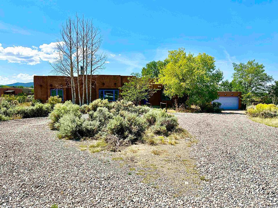 A remarkable home at a remarkable location! This gorgeous house is what most are looking for when it comes to location and comfort. The 1753 (approx.) square foot layout of this house has 3 bedrooms, 2 bathrooms and plenty of open living space. The southwestern style of the house includes wood, tile and carpeted flooring, a large kiva style insert fireplace, Viga with tongue and groove wood ceilings and much more! This home is pueblo style. As you step out the front door, you are greeting with a beautiful view of the world renowned Taos Mountain. This house boasts a large two car detached garage, a large fenced in back yard, mature trees and nice landscaping.