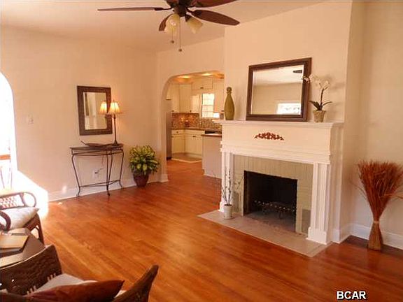 Welcome your family to this adorable 4-bedroom, 2-bath home in the Historic Cove on a large corner lot is move-in ready! This home features beautiful hardwood floors, lots of natural light, lovely archways, wood-burning fireplace, and custom drapes in the dining and living room. It has been newly renovated with updated finishes including whitewashed brick backsplash, and new refrigerator in the kitchen. The backyard is an entertainer's dream! The backyard oasis features a privacy fence and a 12 x 8 storage building with electricity and a ceiling fan. In addition to the nice open deck off the back of this home, there is a stand-alone deck with a pergola. Ride your golf cart around and enjoy the sunsets surrounded by Massalina Bayou. Just a short stroll down to St. Andrew Bay Yacht Club