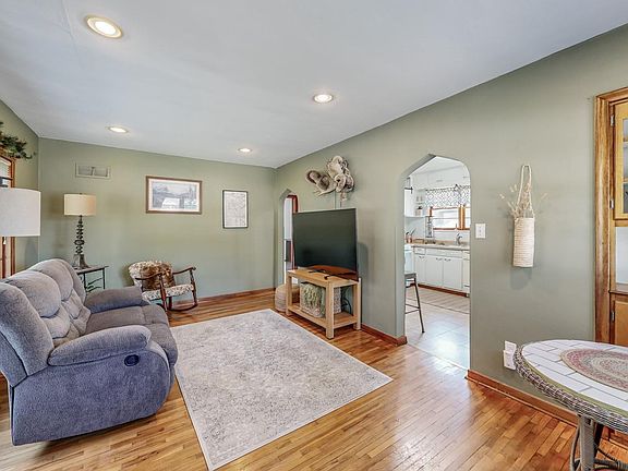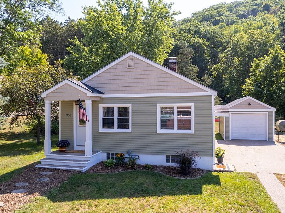 Presenting a move in ready, turnkey home with fantastic location and a beautiful bluff backdrop! Tasteful landscaping and a stone step path welcomes you to the inside to find an open living room with plenty of natural lighting and built-ins. The kitchen is adorned with white cabinets, a gas stove, and vinyl flooring. Other highlights include a walk out to the deck from the primary bedroom, hardwood floors, and a den that can be used for projects, a playroom or other ways to suit your lifestyle. Additionally, all appliance are included even the washer, dryer and water softener. As a bonus, the garage has heating and AC that helps with all your year round project needs. There is also an additional parking area for an RV or other recreational vehicle(s). Enjoy the outdoor sauna or lounge in the outdoors and take in the picturesque views. Your next home awaits you!