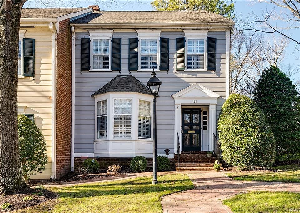 In a quiet cul-de-sac with a covered Entry, Buyers will love this beautiful 3 Bedroom, 2.5 Bath two story condo with a highly desirable end unit location! Large airy Dining Room visually open to an elegant Living Room which, through French doors, adjoins a delightful Sunroom with custom sun shades and 2 skylights with retractable shades. Handsome built-ins are featured in light-filled Sunroom. Living Room has masonry fireplace and electric logs. Spacious Eat-in Kitchen/Bay window with quartz countertops, stainless appliances & Powder Room with marble floor, both completely redone 2018. Three upstairs Bedrooms include a large Ensuite Master with 2 custom fitted double closets. Updated HVAC, excellent Storage and large Attic. All appliances convey. Close-in super convenient Henrico County.