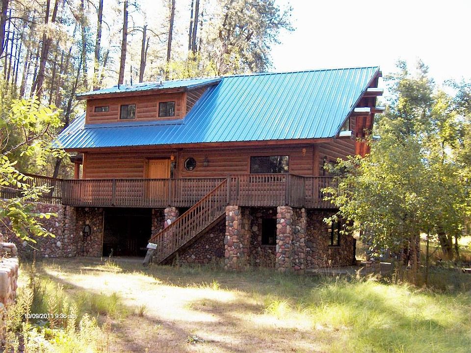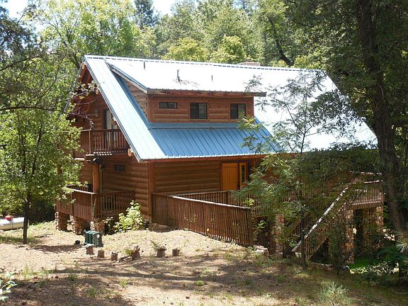 Mountain log home has gorgeous half-log exterior, on approx 1-acre, surrounded by national forest. Approx. 5700 ft altitude, 30 degrees F cooler than the valley. Full-log interior, TNG ceiling. Fireplace and pellet stove; laminate flooring; trash compactor; furnishings included with exception of personal items. Completely self-contained with on-site well, septic, solar and back-up generator. Wrap-around deck; full walk-out basement with 1-car garage; located next to Rose Creek. See MLS Documents for Sub-Division Report, HOA CC&R details.