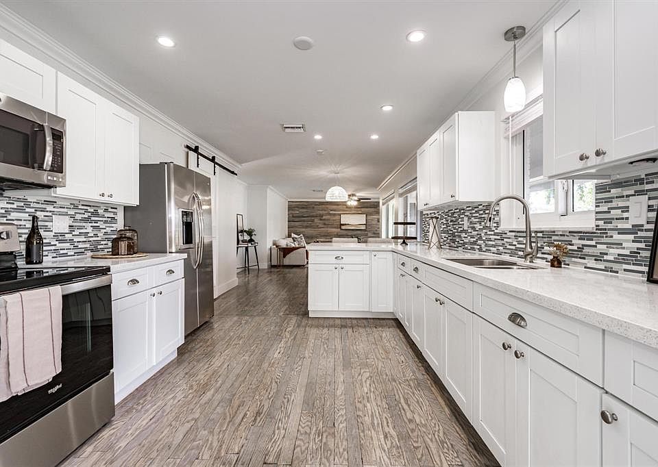 Quartz countertopsCorner lotExterior accessRemodeled kitchenDual drivewaysStainless steel appliancesShaker cabinets