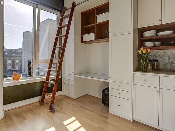 East-facing loft on the Park Blocks is stylish & sophisticated! Walls of windows flood this unit with light to reveal superb quality of total renovation. Gorgeous walnut cabinetry in kitchen and office workspace w/ rolling ladder, Ann Sacks tile, SS appliances, vintage lighting and more. 2 deeded parking spaces, plus access to 10th floor meeting room &party deck. New furnace to be installed 4/20. Immaculate!