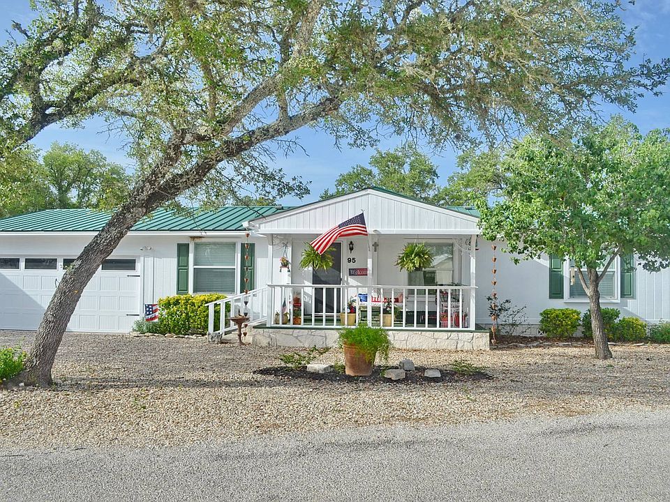 1994 Patriot Homes Model: Independence 1320 Sq. Ft. Lovely home in 55 plus community between Kerrville and Fredericksburg we call this the best of both worlds. 3 Bedroom 2 bath with large master bedroom, has large walk in shower. Both guest rooms have large walk in closets. All appliance convey including washer, dryer and water softener. Metal roof was just cleaned, inside of house was painted in 2021 and outside in 2022. Leaf Guard gutter were installed and in 2021 new fans with lights were put in both guest rooms. Crown molding and double insulated plus storm windows, covered front porch. Double car garage with lots of shelving. Paved patio and storage building out back. Zero scape yard front and back. You can buy the house furnished for 180,000. This is a must see move in ready home