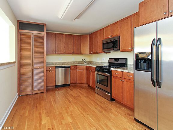 Super Sharp...2nd Floor Unit! Updated Kitchen w/42" Maple Cabinets, Stainless Steel Appliances and eat-in area. All Bedrooms have Ceiling Fans, White 6-Panel Doors, Good Size Closets and New Pella Windows. Living Room W/Wood Laminate Flooring and Slider Leading To Balcony. There is a in-Unit Laundry For your Convenience. Rent includes 1 Parking Space..Heat..Water & Trash. Walking Distance To Metra Train & Shopping.