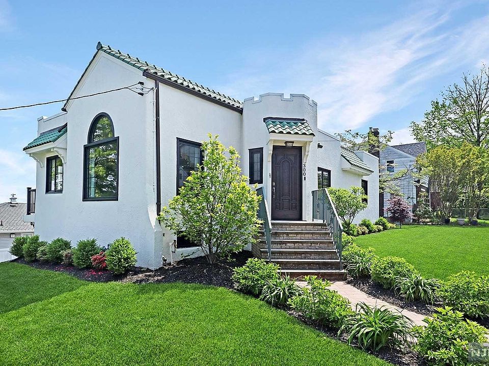 Welcome to this custom built Spanish Colonial home in a fantastic neighborhood overlooking the New York City skyline. As you walk into this architectural beauty, you will love the flow of the ranch-style floor plan and instantly feel at home. The residence boasts high vaulted ceilings, wide arched doorways, decorative fireplace, hardwood floors throughout, new hvac system and custom French casement windows allowing for an abundance of sunlight. Large dining room with original terracotta floors and French doors leading to a balcony that overlooks NYC. Kitchen includes quartz countertops, ss appliances and stone backsplash. Spa-like bathroom with double vanity sinks, marble tile floors, stall shower and soaking tub. Back door leads to a large landscaped yard with new fencing, privacy trees and a beautifully paved patio. Additional features include an attached two car garage with automatic doors, built-in sprinkler system, full basement with 8ft ceilings and half bath.