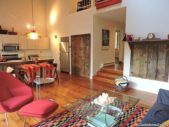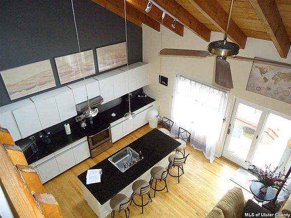 Enjoy the best of the Catskills from this clean and modern take on rustic relaxation. Wide plank pine floors across a huge step down great room; sleek kitchen keeps the chef in the midst of family fun! Stainless and black appliances, cathedral ceiling with skylights, unique barn wood accents in living room, kitchen and guest bath. Entire unit has been designed for maximum style with minimum cleaning hassle. Three spacious bedrooms offer lots of closets and bright light through oversize windows.