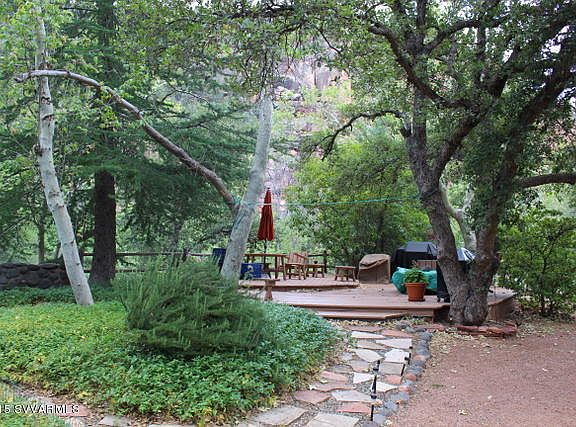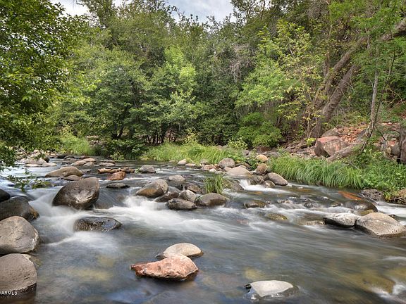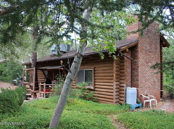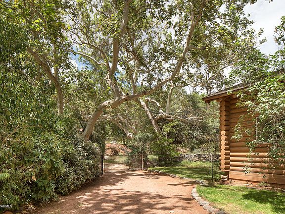 Idyllic retreat for all seasons! Located conveniently at the northern tip of uptown and entrance to Oak creek Canyon, this unique and charming log cabin borders national forest and Oak creek. The gated, exceptional end of the lane third acre lot offers privacy in an incredible setting with plenty of huge sycamores to provide sculptural beauty and refreshing shade in the summer. The mid century home has been well tended and features two bedrooms plus a 29x23 loft, hardwood floors, rustic wood beams and a floor to ceiling brick wood burning fireplace, three patios to enjoy the tranquil sights and sounds of Oak Creek and surrounding red rock cliffs. The property is served by city sewer; the roof was replaced in 2005. Propert has been recently surveyed. Plenty of room for a garden too!