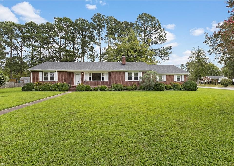 Charming 3 bedroom, 1.5 bath brick home in a quiet, well-established neighborhood just across the water from Smithfield Station and near the historic district. Situated across the street from waterfront properties, the home offers pleasant water views from the front yard. Features include a fully remodeled full bathroom, a 5-year-old roof, and an upgraded central HVAC system, with original baseboard heat still functional. A large wood-burning fireplace commands the living area, creating a warm, welcoming focal point for gatherings. The utility/laundry room, equipped with a half bath and exterior access, ideal for managing everyday routines or outdoor excursions. Additional amenities include a two-car carport, large brick patio, an attached storage shed, and a backyard shed. The large, beautifully landscaped, ultra-low-maintenance yard completes this standout home. Some photos have been virtually staged to help visualize the home's potential.