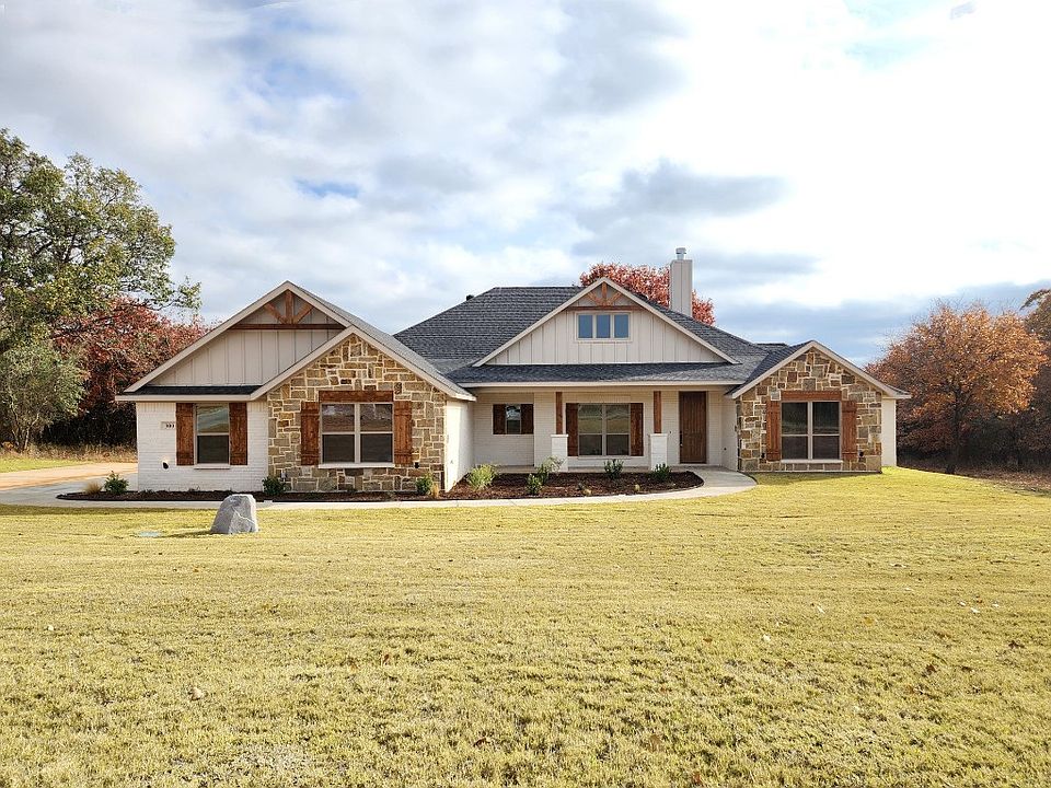 The mud room has a massive mud bench with cabinetry and counterspace too. The master bathroom showcases a freestanding tub, herringbone floor tile, frameless shower glass, pebble tile and a niche. The rear patio faces wooded portion of this 2 acre lot, with plenty of space for the kids to roam. Half bath is tucked into hallway for guest privacy.. Bedrooms 2 and 3 share a large jack and jill style bath with separate door for wet area. Enjoy no water bill, NO HOA, and available fiber internet in this community!