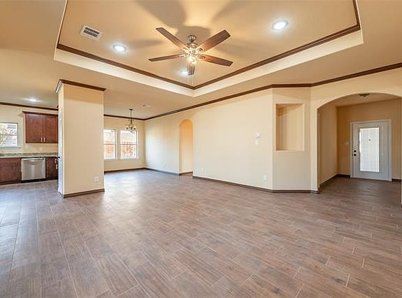 Modern elevation, corner lot new construction, sitting on 11,700 SQFT! This ample new construction offers an inviting vaulted ceiling living space, that naturally transitions into the two dining room spaces, and the contemporary kitchen space. Full of natural light and custom features, such as : crown molding throughout the entire home including the finished garage, luxury flooring in every room, private master bedroom on opposite end of the home complete with a tub and shower, double vanities, and a dream master closet!