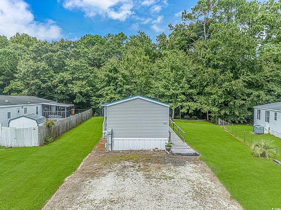 Find your lovely, affordable home here in the heart of Pawleys Island! This manufactured home is available with land and no HOA. Great for your primary home, second home or for short term or long term rentals, whether nightly, weekly, monthly or yearly as your next investment property. When you step inside, you'll love the open floor plan with a spacious kitchen and living area. The cabinets, Travertine countertops, and modern light fixtures give the kitchen and dining area a fresh look and cozy feeling. You will find two bedrooms with ceiling fans in both, as well as two full baths. The den is carpeted with sliding glass doors that lead to a large wooden deck, a recent addition that wraps around on one side of the home. Upgrades since purchase include a new Trane HVAC system, Stainless steel refridgerator, double sink and faucets and more. Enjoy relaxing, grilling out and dining on your back porch nestled by the trees for privacy and peacefulness. Enjoy the use of the outdoor building with electricity for even more storage. Outdoor wood platform also added with outdoor sink, and upgraded landscaping. Enjoy this lovely home and only a short drive, golf cart or bike ride to the beautiful beaches of Litchfield and Pawleys Island. As one of the only homes in Pawleys Island in such a great price point, the beach life can be yours without stressing you or your budget. Call or text and schedule your showing today!