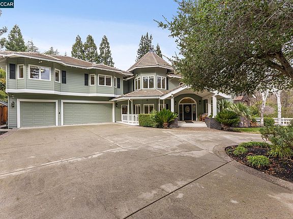 This Hampton style Westside home is nestled up against the Las Trampas ridge on one of Alamo's coveted, picturesque streets, combining casual living with laid-back luxury. The expansive covered front porch beckons one to linger and enjoy the surrounding scenery. Upon entering the front door, the soaring ceilings of the grand foyer and swooping staircase greet you. The spacious formal rooms with a gas fireplace and a wine room are off the foyer. The home boasts six bedrooms - five of which are en-suite. The sixth bedroom is on the main level and can be used as an office or a guest room as there is a separate entrance and an adjacent full bath. The kitchen opens to a large family room which overlooks the park-like backyard with its sparkling pool, spa, sport court, patio, barbecue area and expansive turf for lawn games. The many palm trees compliment the ambiance of the ideal California backyard oasis. Play a game of pool in the upstairs bonus room equip with a drink refrigerator, ice machine, microwave and sink. There is even a mirrored dance or workout studio with a hardwood spring professional dance floor and ballet barre. This floor plan offers an array of options from everyday living to relaxation or entertainment. Welcome Home!