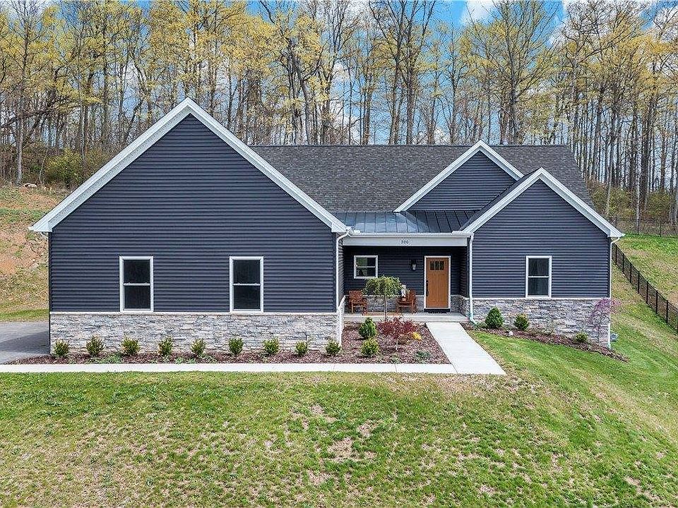 Set on nearly an acre, this recently built property blends character & modern function - all on one level. An inviting covered front porch leads to a welcoming foyer w/ an open layout featuring a kitchen w/ a 9-foot butcher block island, farmhouse sink, black matte countertops, black lower cabinets & crisp white uppers + a unique built-in dog nook. The kitchen opens to a family room w/ fireplace & a dining room w/ custom glass dividers. The spacious owner's suite offers a large walk-in closet & private bath w/ double vanity & a tiled walk-in shower. Two additional bedrooms & a full bath are located on the opposite side of the home for added privacy. Completing the layout are a spacious walk-in pantry, half bath, well-placed laundry area, a flexible-use room + convenient access to the back patio & two car garage. A full basement w/ rough-ins is ready for your future plans. Thoughtfully crafted throughout, this home offers style & comfort, perfect for easy living & entertaining.