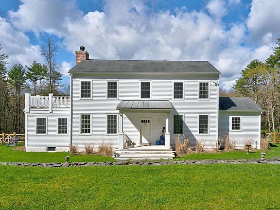 What do you get when you blend a hint of southern, Federal-style vernacular with a dash of chic contemporary farmhouse? Behold 300 Tuthill Rd. This is a recently built home with a timeless elegance. From its calming white on white exterior to its private setting, the home seems to come from another era. The land slopes gently down to the in-ground and heated saline pool below. The central stairway doubles as a division of the large spaces; the generously sized living room to the left, and over to the dining room and kitchen to the right. The living area is nicely situated with a large brick fireplace as its focal point. Just past the living room is a lovely room surrounded by 5 windows on 3 sides, a sweet window seat there in the middle. The works great as a den, overflow bedroom or office. Heading down for a dip in the pool, a swimmer descends bluestone stairs and enters through the gate. The fencing was recently added and it’s a fantastic way to keep the kiddies and family pets from roaming. There is a sweet fire pit and room for loads of pool furniture.