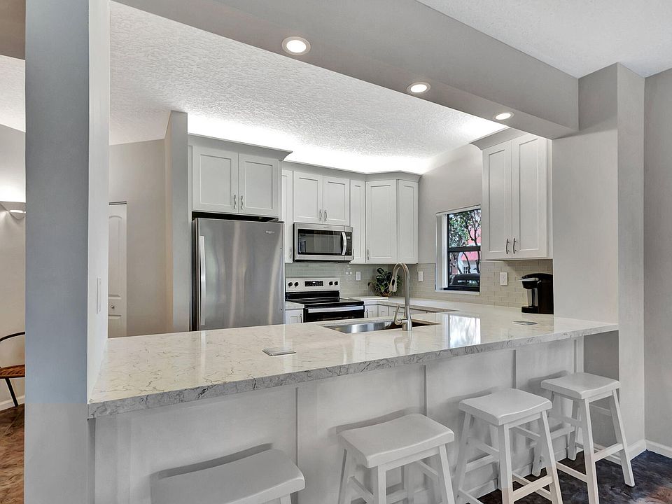 Beautifully renovated 3-bed, 2-bath first-floor end unit! Filled with natural light, this condo features extra windows, a brand-new kitchen with custom cabinetry, quartz countertops, designer glass backsplash, and stainless steel appliances. Both bathrooms include modern vanities and stylish mirrors. Tile flooring in main living areas and laminate in bedrooms. Enjoy a private patio with serene lagoon views. Located in a gated community offering two pools with Jacuzzi tubs, a fitness center, and BBQ area. Just minutes from beaches, boating, golf, shopping, and dining. ROOF ASSESSMENT PAID! A/C 2022 | Water Heater 2022 Don't miss your chance to own a piece of paradise--schedule your showing today!