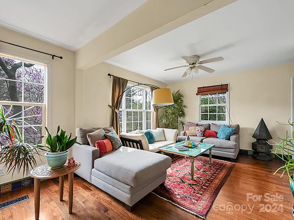 Super sweet home with all the charm of West Asheville. Featuring large covered front and rear porches to enjoy outside entertaining or just hanging out. Welcoming entrance to a light filled open living spaces, with decorator tile baseboard accents, curved archway to kitchen and wrought iron handrails. Living room and Den has beautiful hardwood floors. Cozy den with gas propane stove for supplemental heat. Upper level has three spacious bedrooms, full bath and laundry closet. Basement offers a workshop and lots of storage. Move in ready, new metal roof, exterior recently painted and garage door replaced last year. Level rear yard for a great play area for family and pets. Located just moments away from West Asheville's eclectic array of restaurants, shops, and entertainment options.