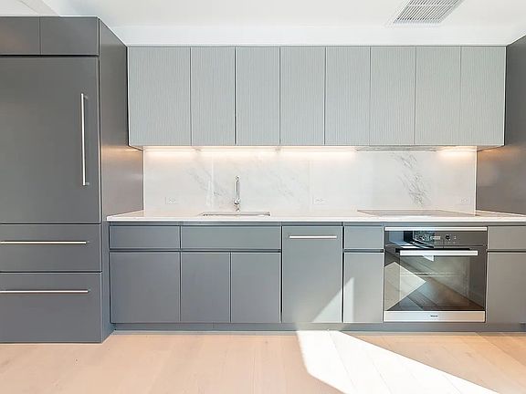 This one bedroom, one bathroom unit enjoys southwest-facing exposure, which brings perfect sunlight, with dramatic floor-to-ceiling windows and wide white oak flooring throughout. The open kitchen features fully integrated Miele appliances, and ample lustrous white marble counters. The bathroom invokes a feeling of calm and relaxation with sophisticated elements such as white marble, satin birch wood-finished vanities with fluted cabinet doors, radiant heated floors, custom polished chrome faucets by Jaklo designed by Workshop/APD, and a rain shower. Deep closets which complete your storage needs, and residents will enjoy the convenience of an in-home washer and dryer.