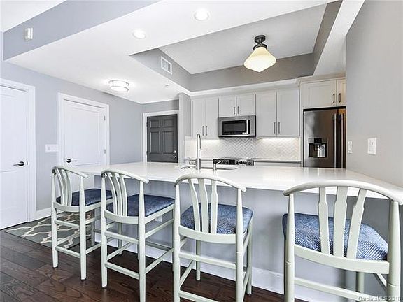 Remarkable decorator renovation of this very special condo. Oversized end unit in highly sought after Fifth and Poplar condos which offers all amenities. Open floor plan with oversized living room, an expanded kitchen and rare dining space for a full table. Upgrades include new cabinets with soft close drawers, oversized island with huge, one piece Caesarstone London Gray counter. Fixtures include Hansgrohe German faucets throughout, Franke undermount sink and a custom herringbone designed backsplash. Appliances are Professional Series package. Full size washer and dryer, solid core doors and extensive Elfa closet systems in all spaces. Designer quality hardwoods, tile and all bathroom upfit. You will not see another condo with this kind of quality. It is like new and has been done with taste and quality in mind.