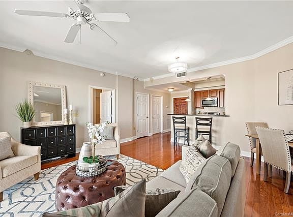 Pristine, split floorplan 2 bed/2 bath condo at Fifth and Poplar. Kitchen with granite countertops and stainless steel appliances opens to bright, spacious living and dining area, complete with covered balcony and expansive views. Both bedrooms feature ensuite bathrooms and generous closets. Master suite includes private sitting room that could be used as an office. Fresh paint and wood floors throughout. An urban oasis in the heart of Uptown, Fifth and Poplar offers incredible amenities, including its resort-like pool, well-equipped fitness center, putting green, and pet walk. Gated complex with 24-hour concierge and secure access. Grocery store in ground level retail space. Walk to sporting events, bars, restaurants, and all that Uptown has to offer.