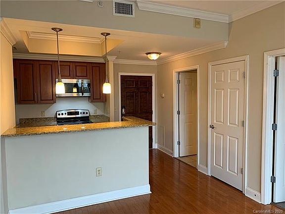 Breathtaking views of uptown skyline and Forth Ward Park from this top 6th floor condo! In one of Uptown's most prestigious buildings. Excellent condition! High ceilings, Stainless steel appliances, granite counters, berber carpet and hardwoods in living area with a balcony. Fantastic amenities include the club house, pool, fitness center, coffee bar, media/billiard room, beautiful courtyard landscaping, 1 acre piazza style park with a putting green, dog park and 24 hour concierge. Enjoy the city life and walk to all Uptown and 4th Ward has to offer! Harris Teeter is at the base of the building. Just a short distance to Knights & Panthers stadiums as well as Fourth Ward Park. Multiple elevator banks. Secured parking deck and reserved space is #20. Building charges a $250 move in fee and a $250 deposit that is returned after move in.