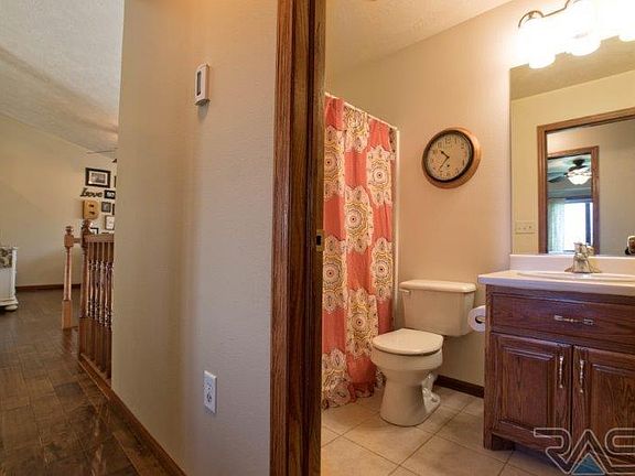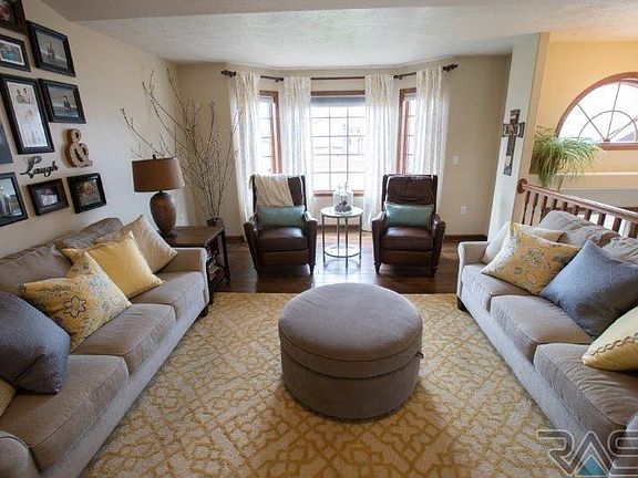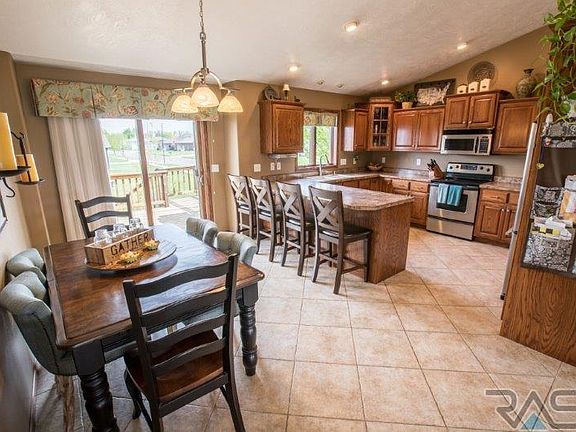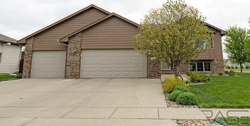 Beautifully cared for home in Tea close to the park. 4 bedroom, 3 bath, 3 stall garage split foyer w/ hardwood floors, ceramic tile, warm colors & beautiful light fixtures is presented for under $250K. Kitchen & dining are quite spacious & offers lots of space for the home chef to make the big meal for holiday get-togethers & large dinner parties. Lots of cabinets & counter space. Vaulted ceilings going into the spacious living room make it great for entertaining. Master bedroom has large WIC, whirlpool tub, shower, & double vanities. 2nd bedroom also has a WIC. Hardwood floors go throughout the living room & master bedroom. Lower level is very spacious, perfect for family time w/ built-in fireplace, cabinets, & surround sound. Spacious yard w/ beautiful trees, sprinkler system & landscaping. The house also features raised panel doors, Anderson windows, high efficiency furnace, large foyer, finished laundry room, & a deck overlooking the big backyard.