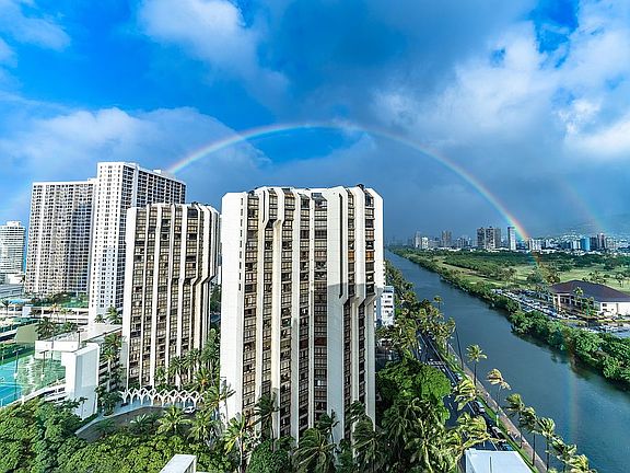 Rare one-of-a-kind largest 1-bedroom Penthouse suit with its very own private rooftop lanai with fantastic views of the golf course, marina/canal, mountain, ocean, and sunset. This immaculate property features an open layout living space with floor to ceiling windows in the living room and bedroom. Plenty of closet space in the bedroom, and a spiral stairway that leads up to the rooftop. The unit has been tastefully furnish (partially). Great amenities to enjoy such as, BBQ area, largest pool in Waikiki, recreation area, beautiful koi ponds, whirlpool spa, tennis courts, secure building. and more. Walking distance to Waikiki beach, Kapiolani park and zoo. Water/Sewer, Internet, Cable included